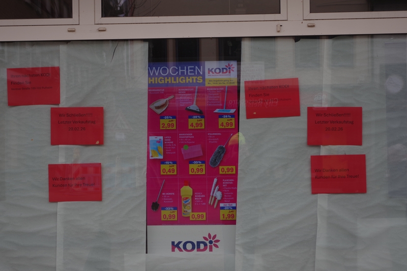 Der Haushaltswarendiscounter KODI betrieb seit Jahren eine Filiale in der Bergheimer Fußgängerzone (Hauptstraße 51-53). Diese Filiale wurde in der vergangenen Woche dichtgemacht. Letzter Verkaufstag war der 20. Februar 2026. (Siehe Fotos unten.) Wie man auf wdr.de lesen kann, hatte KODI im November 2024 – wegen drohender Zahlungsunfähigkeit und Überschuldung – ein Schutzschirmverfahren beantragt. Es war demnach geplant, 80 von von 230 Filialen zu schließen. “Gründe für die Schieflage waren nach eigenen Angaben eine Kaufzurückhaltung der Kunden sowie deutlich gestiegene Kosten, etwa für Energie, Fracht und Werbung.” Laut den Aushängen im Schaufenster befindet sich die nächste noch offene KODI-Filiale in Pulheim (Venloer Straße 100-102).
